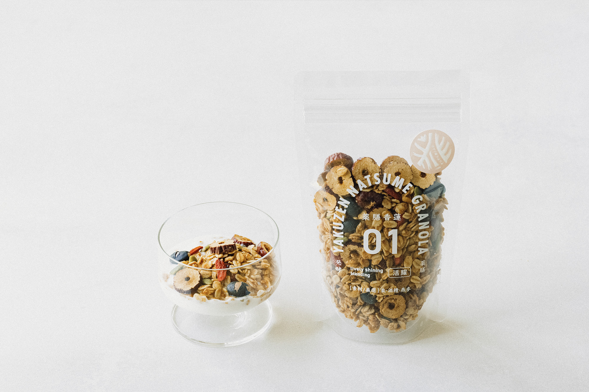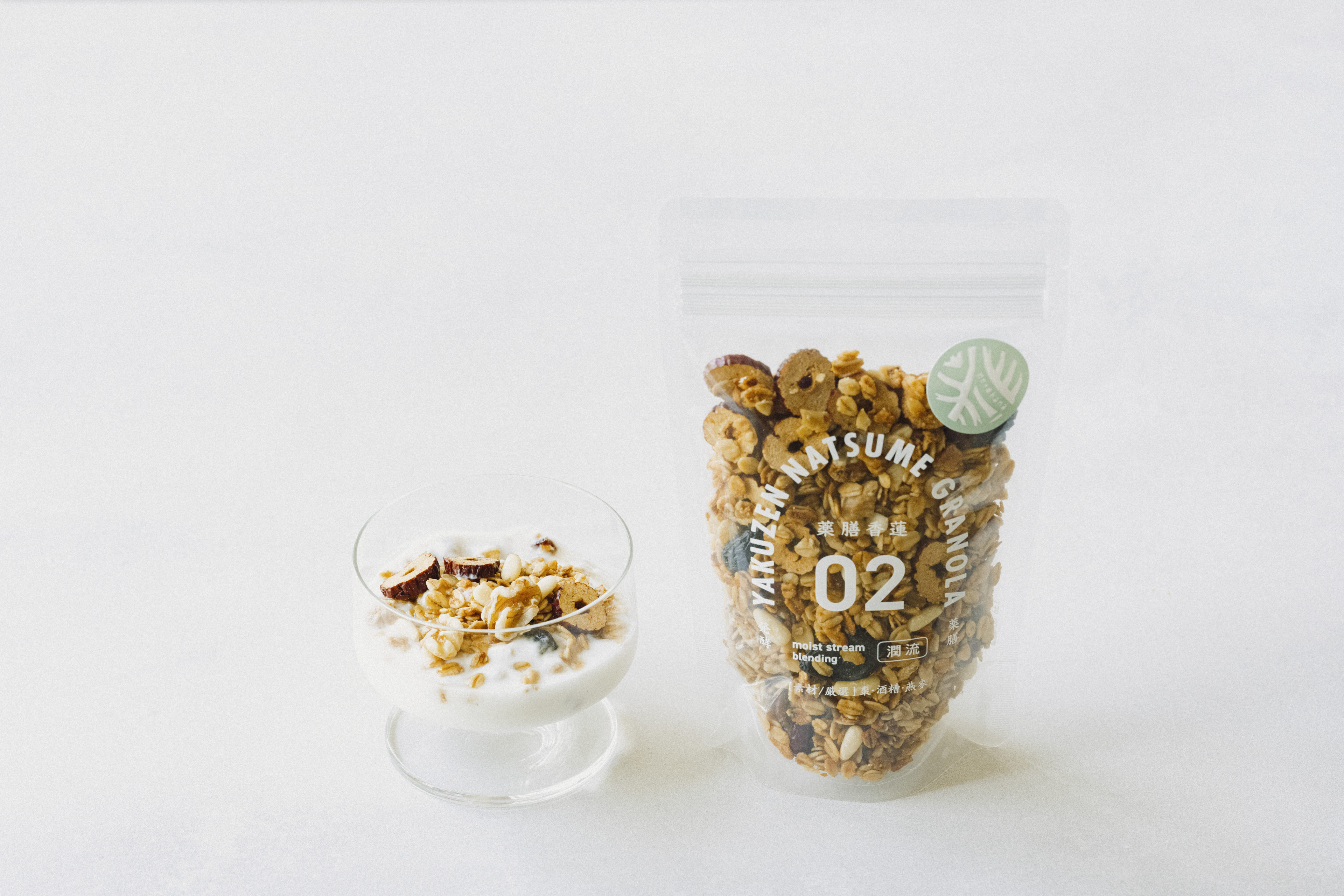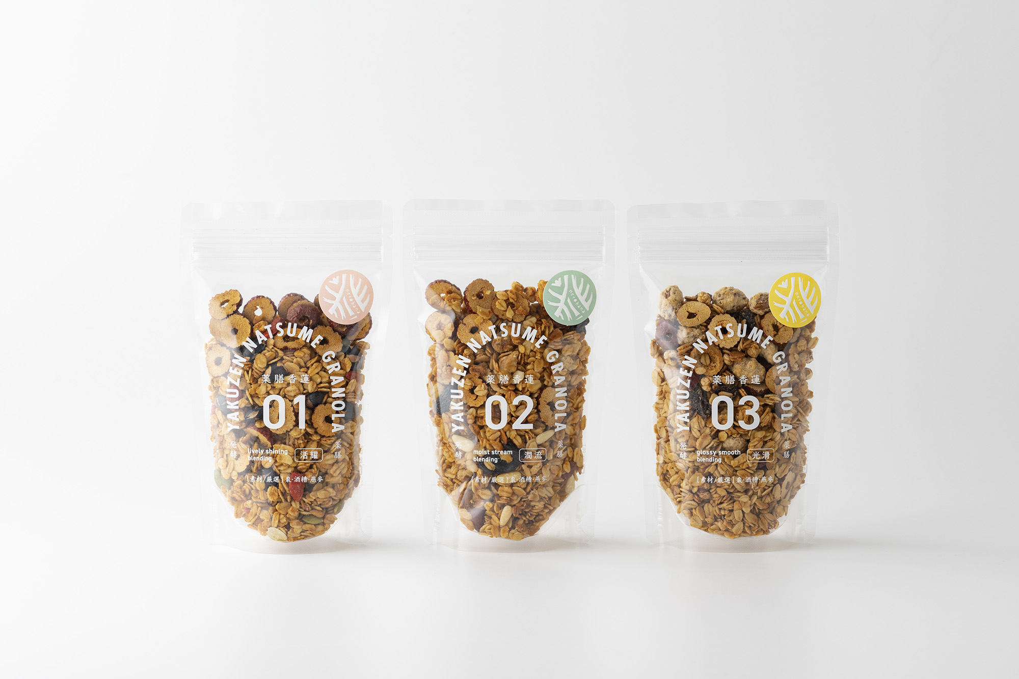 This granola package combines jujube and oats with three medicinal ingredients selected for their specific health benefits. We aimed for a design that blends traditional Chinese medicine imagery with the casual feel of granola, creating something you’d be happy to leave out on your kitchen counter. The logo sticker, featuring an embossed design, symbolizes “roots and flowers”—a concept rooted in Eastern medicine.